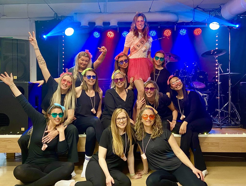 Vi avslutar med att lyssna på hela låten i vår stora ljudanläggning och ta gruppfoton på vår scen med proffsig scenbelysning.